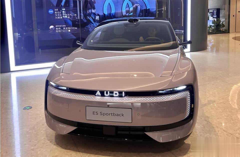 上图就是刚刚到店的“奥迪E5 Sportback”,确实,从车头到车尾,从外观到内饰,在它身上我们找不到任何传统奥迪的元素。首先在正面,因为采用了纯电驱动所以整个车头全部采用了封闭式的设计,而环绕在车头四周的是内嵌式的灯带,并且在最上方还加入了部分点阵式的元素,配合主光源,能营造出非常出色的视觉冲击。而位于顶部的中间位置则是AUDI的英文字母,也就是说这款专属车型将首次采用全新的LOGO。前包围的底部还是保留了部分梯字形的元素,但两侧则与车身贯通到一起。