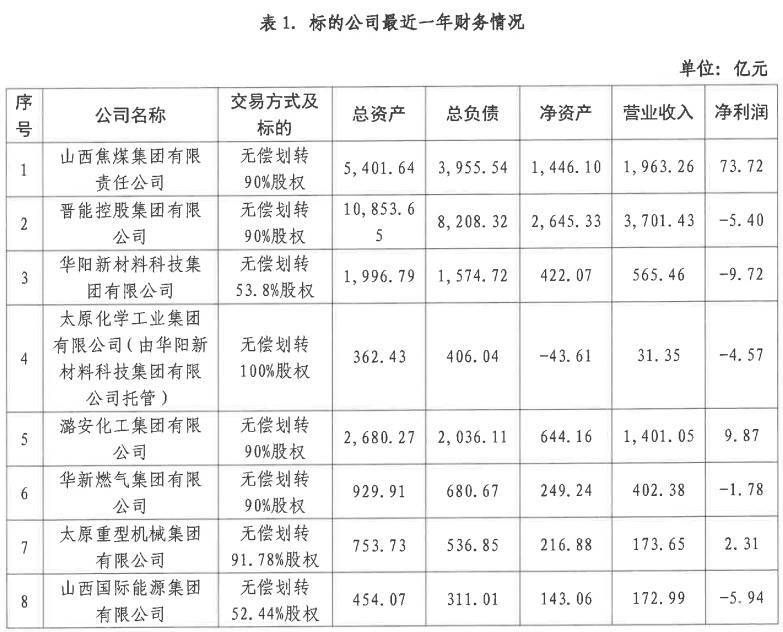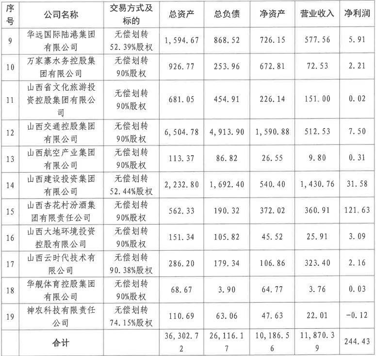 本次股权划转完成后,19家划转标的公司将不再纳入山西省国有资本运营有限公司合并范围,包括山西交通控股集团、山西建设投资集团、山西航空产业集团、山西焦煤集团、晋能控股集团等,资产规模合计达3.63万亿元,最近一年营收合计1.19万亿元,净利润244.43亿元。