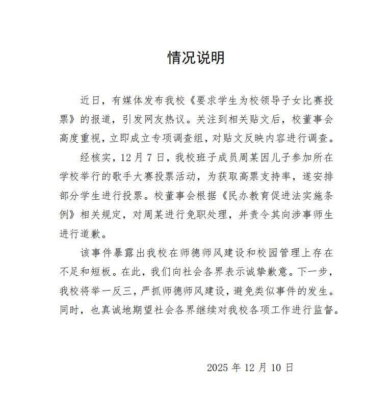 经核实,12月7日,我校班子成员周某因儿子参加所在学校举行的歌手大赛投票活动,为获取高票支持率,遂安排部分学生进行投票。校董事会根据《民办教育促进法实施条例》相关规定,对周某进行免职处理,并责令其向涉事师生进行道歉。