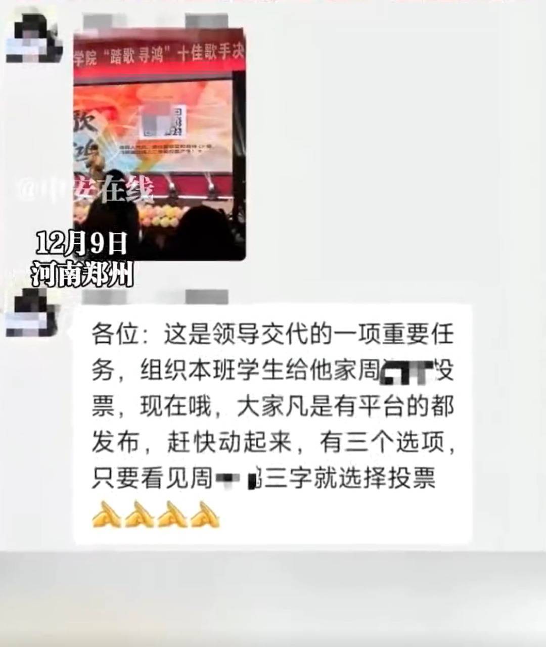 视频里,该名学生分享了一张聊天截图,群内发布了一张某学校十佳歌手的舞台照,另发布了一条消息,消息称“这是领导交代的一项重要任务,组织本班学生给他家周某某投票,凡是有平台的都发布”,群内的该发布人还表示,“只要看见周某某三个字就选择投票”。随后,博主又发布了一则班主任要求删除视频的内容。并附文“学校领导强制要求删视频。”